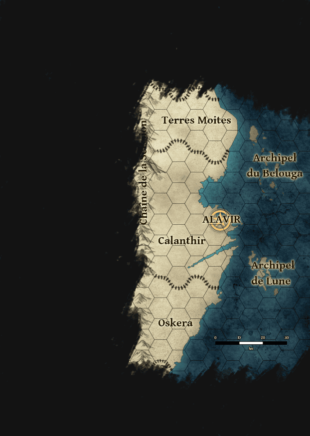 Alavir se situe dans le Calanthir, une région au climat tempéré occupée seulement par quelques communautés éparses. Faisant face à cette région, l’archipel du Belouga et l’archipel de Lune se partagent sur des dizaines d’îles de tailles variées. Au nord, s’étendent les jungles tropicales des Terres Moites et au sud, les forêts de pins d’Oskera. Enfin, à l’ouest, traversant l’île de part en part, se dresse la vertigineuse Chaîne de la Scission, un défilé de montagnes connu pour être infranchissable.