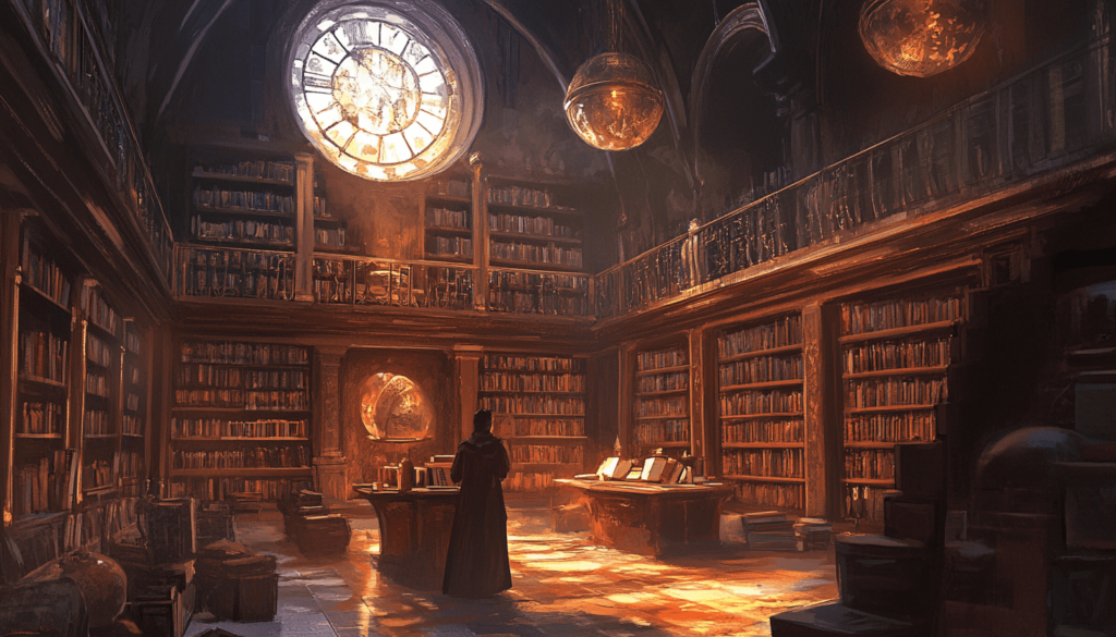 Dès qu’on pénètre à l’intérieur, un mélange d’odeur de vieux livres et d’encens chatouille les narines. Des centaines d’ouvrages et de parchemins débordent de toute part, le plus souvent mal rangés : les essais sur la métamagie côtoient les contes pour enfants. Un vrai chaos de connaissances, un endroit biscornu où les livres s’empilent en tours chancelantes et où les étagères craquent sinistrement sous le poids du savoir.